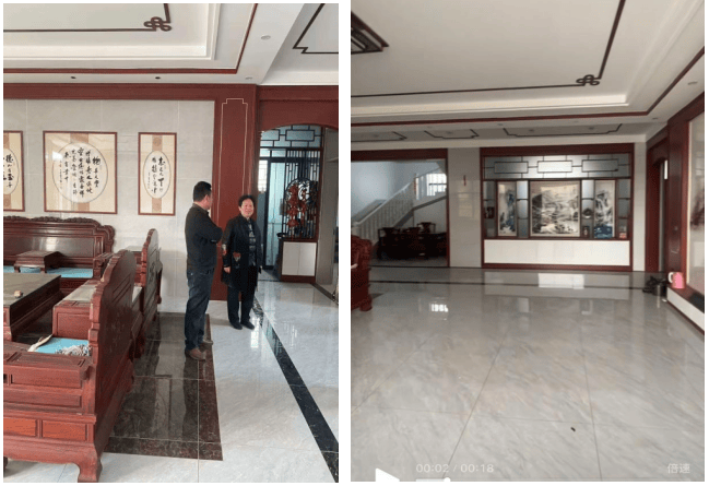 抬步移入主房,但见客厅两间通厅,开阔敞亮,然气散不聚,殊为可惜。通厅虽大,但入宅之气直来直去,难以停留,此谓“有容而无蓄”。中堂布局亦不到位,本应设案供福、挂画镇宅,此处却仅中间一副中堂挂画,旁边却是博物架空格,失了中堂“纳福迎祥、统摄一宅”的核心作用。如此一来,纵有高门大宅,亦是气散财消、家运不聚之象。